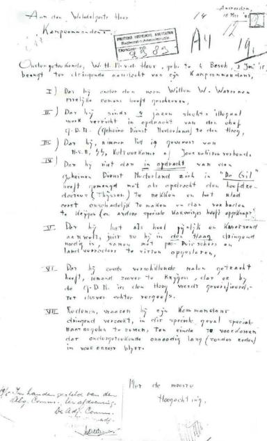 | VI | Dat hij reeds verschillende malen getracht heeft, iemand zoover te krijgen, dat er bij de G. D. N. in den Haag wordt geverifieerd, - tot dusver echter vergeefs. |